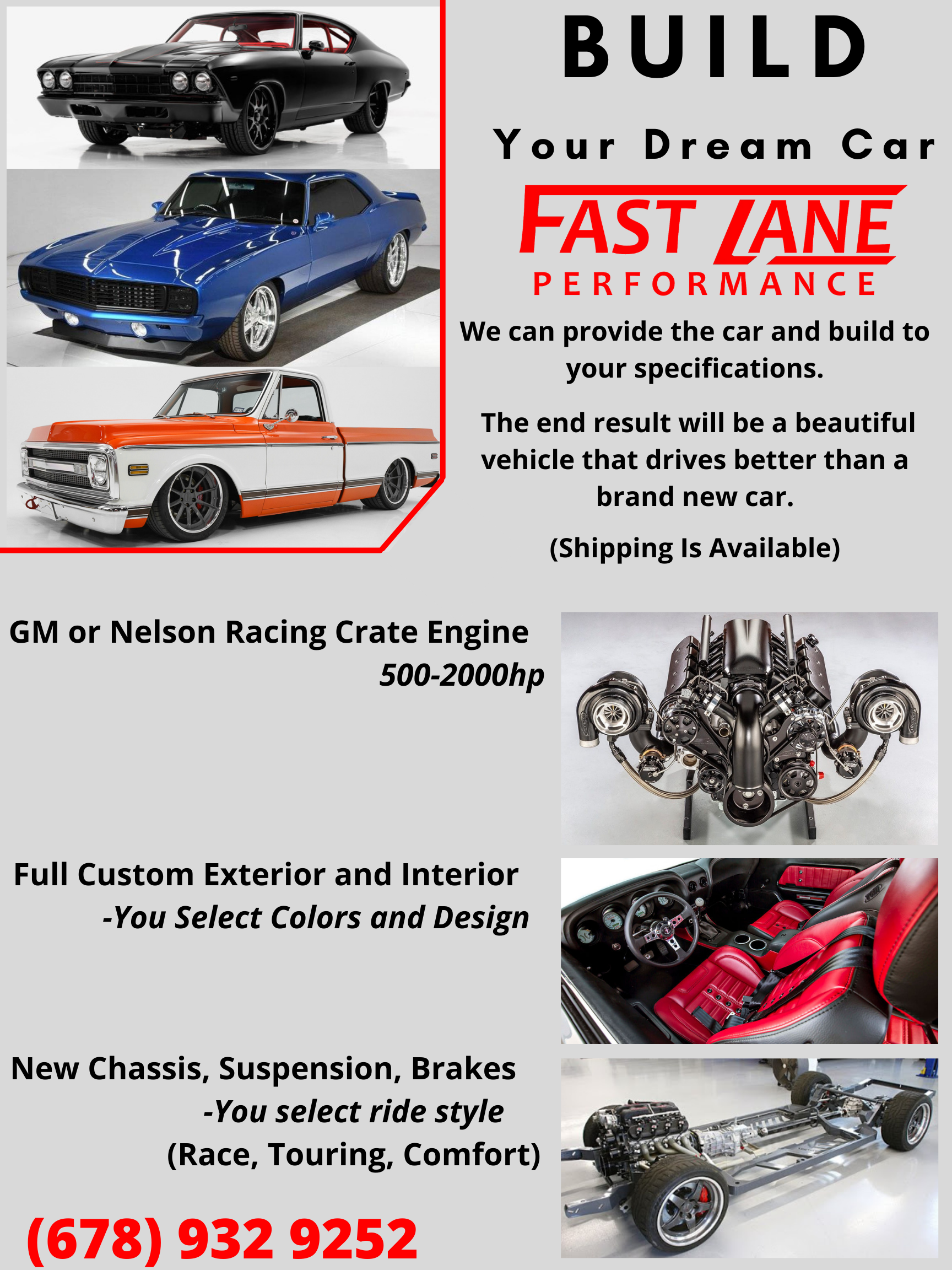 We also build top notch Pro-Touring and Restomods from the ground up. When we build a car from the ground up, we use tubular suspension, coil overs, with fully loaded interiors. Often we even add heated and ventilated seats to get a very modern feel. When we build an entire car, we keep performance and reliability in mind, therefore modern fuel injected engines and over drive transmissions are commonly used.